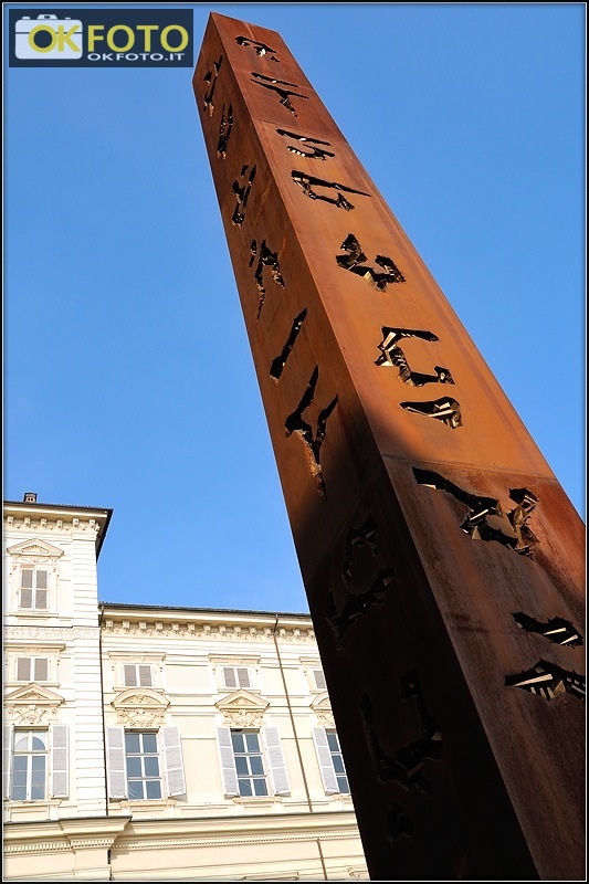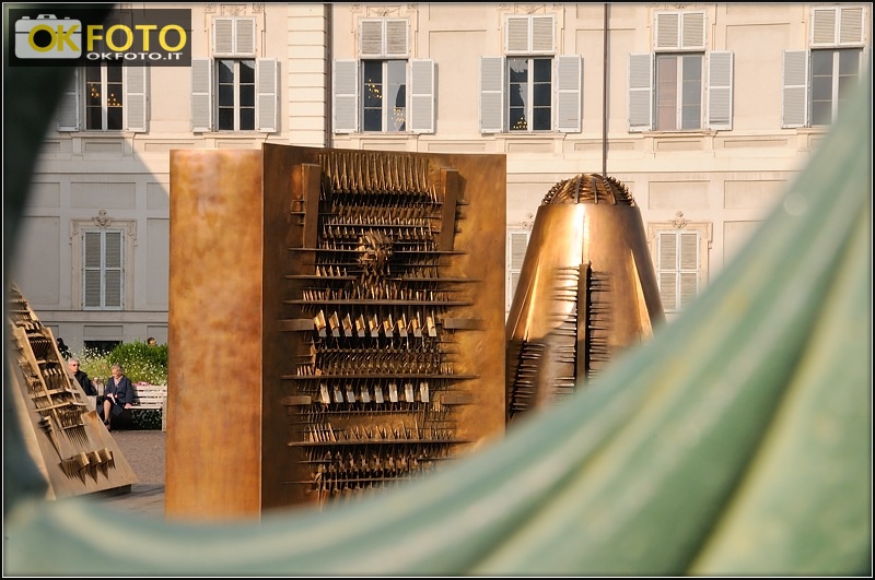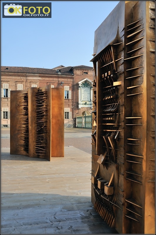 Infatti, grazie alle sue opere esposte anche noi riusciamo a immaginare nuovi scenari: le gigantesche realizzazioni appaiono dietro i fregi dorati della cancellata di Pelagio Palagi e, proprio come in una rappresentazione teatrale, consentono di vedere piazza Castello senza il suo grattacielo nascosto dall’Obelisco, permettono di immaginare la torre di Palazzo Madama fusa con una scultura quasi a divenire un’astronave, mettono in risalto la bianca facciata del Palazzo Reale che pare più lucente in contrasto con il colore scuro delle sculture. E così più di qualcuno si ferma a riflettere, quasi in raccoglimento, sulla bellezza dell’arte.