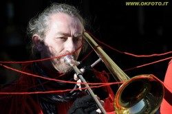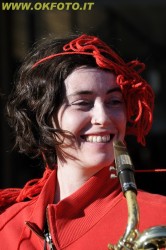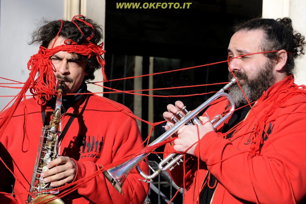 Nelle nostre foto, un filo di lana rossa lega tra loro i componenti del gruppo musicale Brassvolè e le persone che ascoltano la loro musica coinvolgente, sabato mattina in piazza San Carlo a Torino.